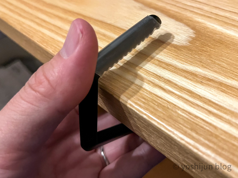「MILESTO バッグハンガー」の設置はとても簡単で、滑り止めチューブ側を上にして引っかけたい部分に差し込むだけです。